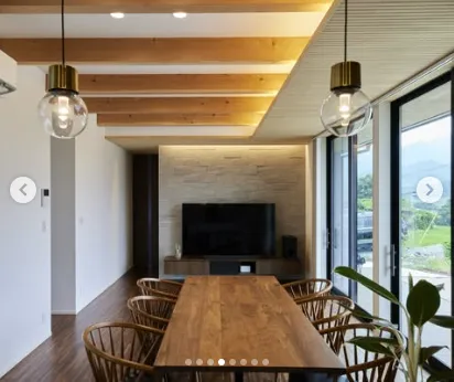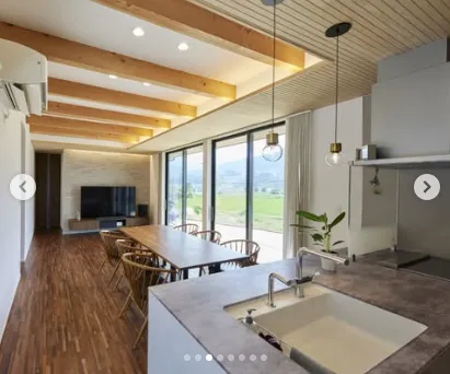 リビングは緑に向かって開かれ、