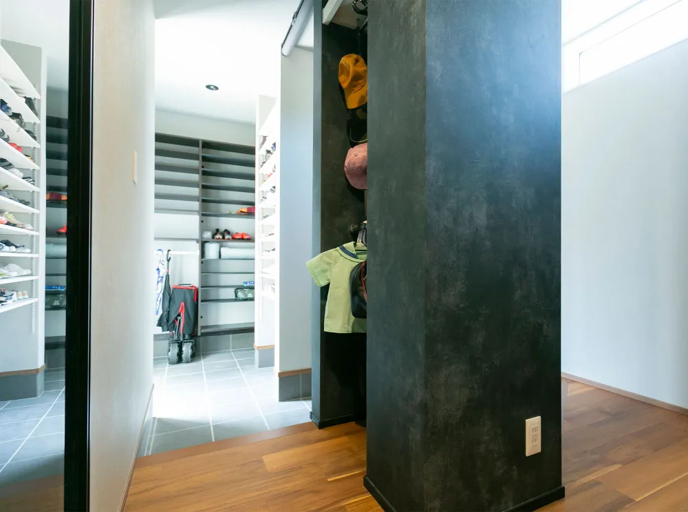 シューズクロークは家族の靴がすべて収納できる容量を確保。上着を掛けられる棚も用意しています。