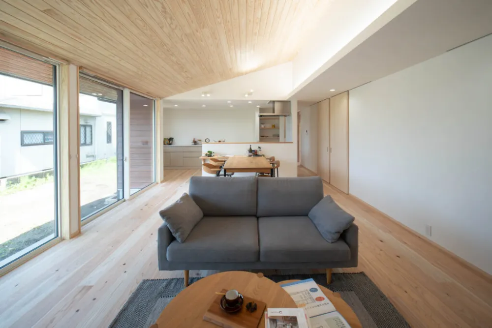 限られた敷地を有効に広く感じるための工夫があるリビング。