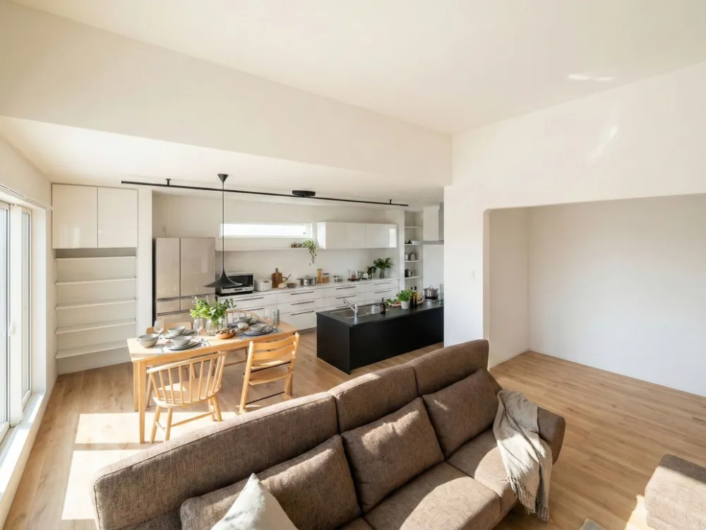 明るくナチュラルなLDK空間に、洗練された黒のアイランドキッチンが美しく映えるモダンスタイル。 背面の壁一面に設けた大容量の白いカップボードで、生活感をすっきりと隠して美しい空間を保てます。 キッチンには大人気のトリプルワイドIHと幅60cmフロントオープン食洗機を搭載し、見た目の美しさと圧倒的な使いやすさを両立しました。 光にあふれた、いつまでも居たくなるようなリビングダイニングです。