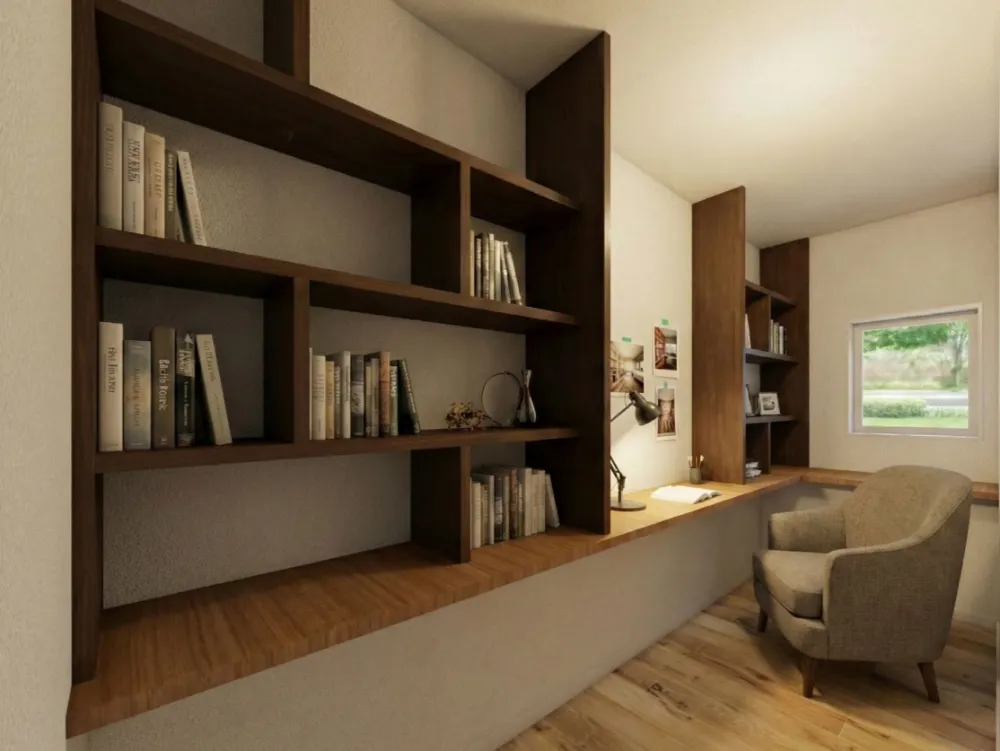 大工さん造作の大きな本棚が目を惹くおこもり書斎。視線と集中をコントロールするL字設計で、趣味や仕事に没頭できる秘密空間です。