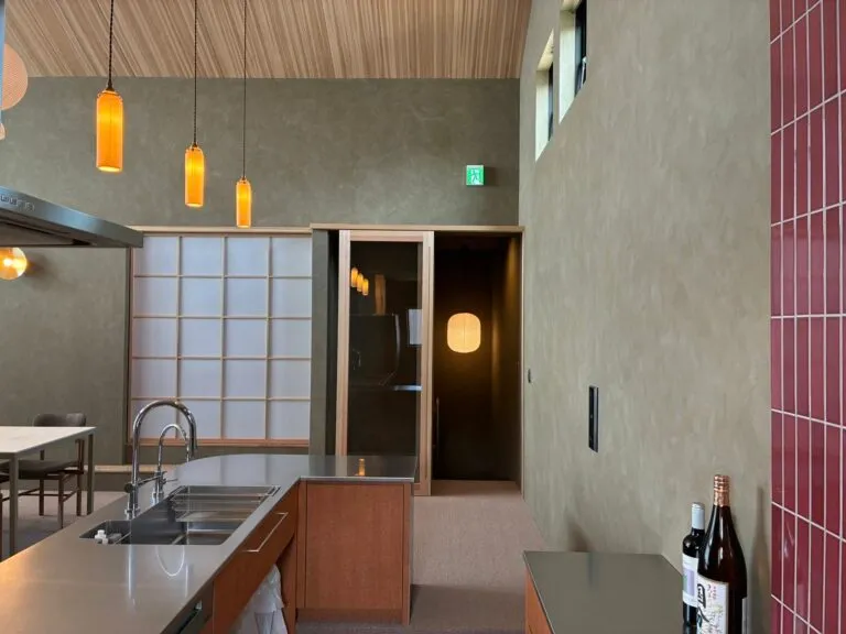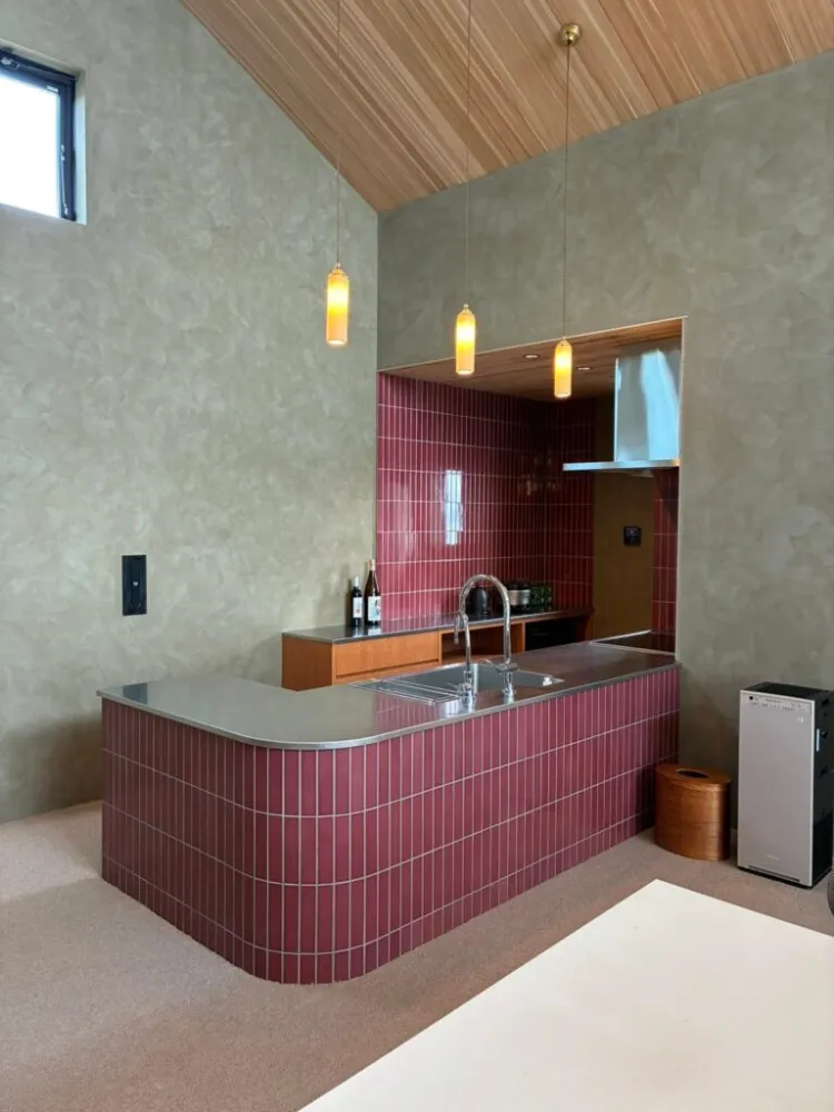 民泊ですが2階リビングやなぐり仕上げの床、造作キッチンや洗面。